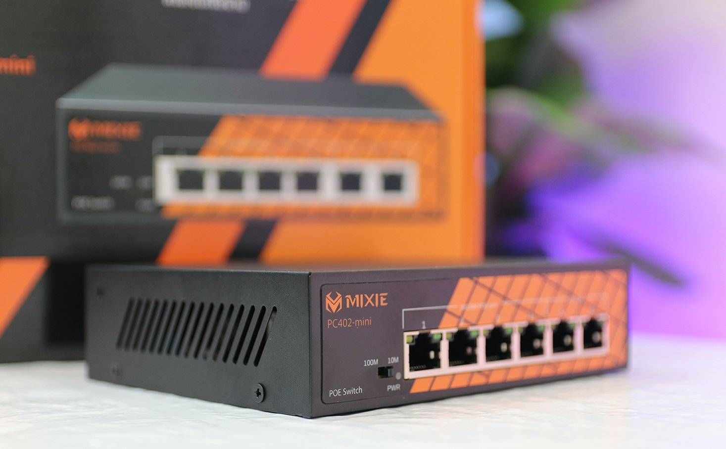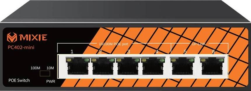 Switch Poe MIXIE PC-402-Mini gồm 4 cổng POE RJ45 10/100M và 2 cổng UPlink tốc độ 10/100m